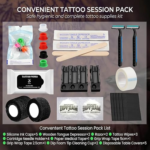 Contents of the pack: Grip cover black 5cm x 4.5m x1; Grip cover black 2.5cm x 4.5m x1; Sterile tongue depressors x2; Razors x2; Paper Medical Tape x1; Sterile silicone cups x5; Dental bibs x5; Cleaning wipes x3; Cartridge needle holder x4; Dip Foam Tip Cleaning × 2;