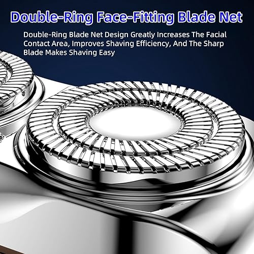【Double-Ring Magnetic Cutter】: The rotary shaver is equipped with a powerful high-speed motor. The 2 floating cutter heads with double-ring arc ultra-thin cutter net and self-sharpening steel blade design can be better close to your face to achieve a clean shave without pulling or missing any hair.