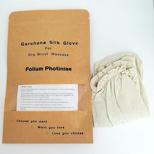 Made out of 100% raw silk, the Folium Photiniae massage gloves remove dead skin cells, brightens the skin, leaving it silky and soft. Use Garshana raw silk gloves before a shower to open and make the pores more receptive to moisture Anti-Cellulite Exfoliating Gloves: These dry gloves help stimulate your blood circulation by increasing the blood flow within the skin. This exfoliating experience helps breaks down cellulite lumps and make the skin smoother and toned.