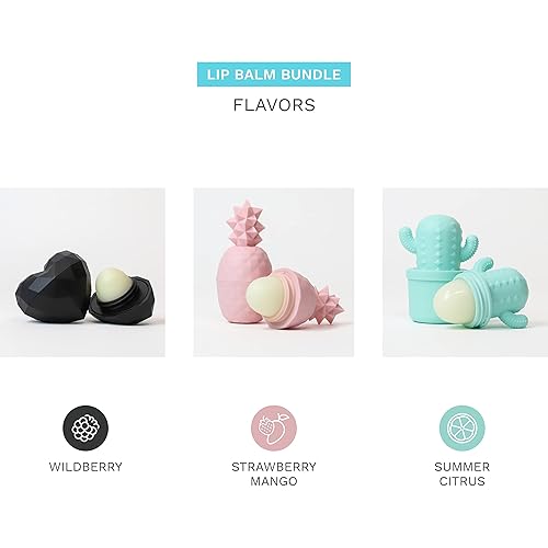 Featuring our 3 classic cute designs in three delicious flavors - wildberry, strawberry-mango, and summer citrus. You'll never get tired of them! This trio is sure to please your lips and your senses; each balm is made with our signature nourishing formula of sweet almond oil, coconut oil, vitamin E and beeswax, ensuring that your lips stay moisturized and luscious all day long.