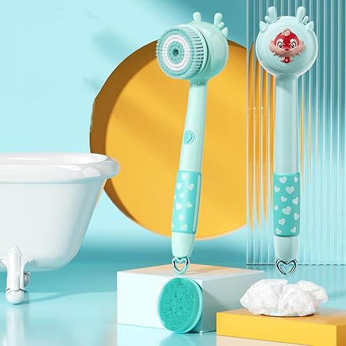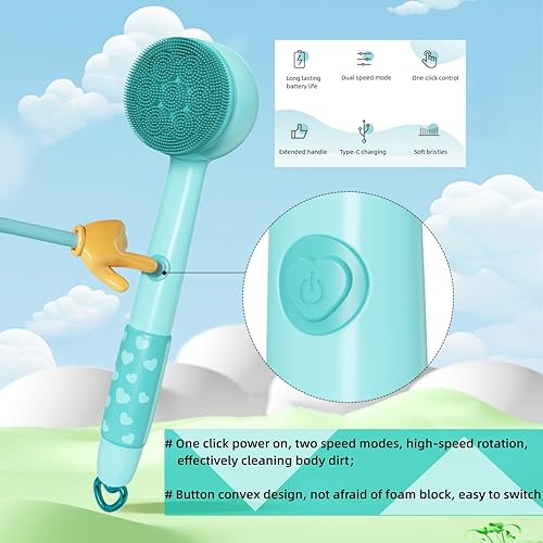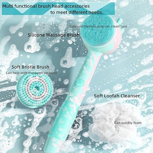 【3 Replacement Brush Heads】:The electric bath brush is equipped with soft loofah cleanser,silicone massage brush and soft bristle brush.Three types of brush heads can easily meet different cleaning needs. The body brush for showering can be used for facial cleaning, daily bath, back brushes, rotary massagers and foot scrubbers, provide the children with a comfortable spa experience.