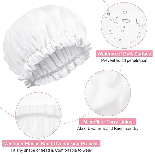 Double Layer Shower Cap: The waterproof shower cap is made of two layers, the outer layer is waterproof EVA cloth, and the inner layer is terry cloth which absorbs moisture and steam to keep your hair dry and prevent frizz during showering