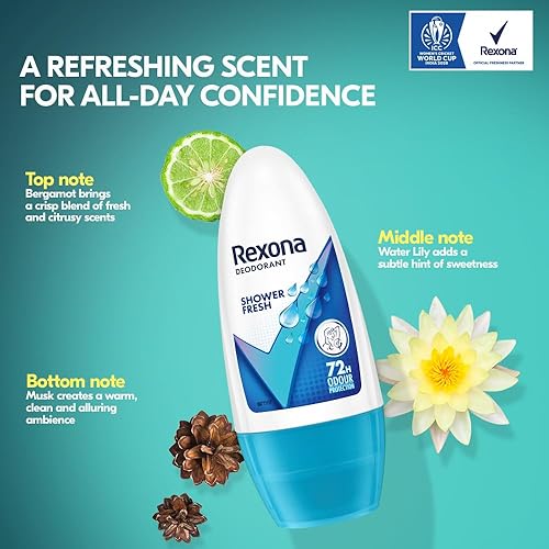 Rexona Shower Fresh Underarm Roll On Deodorant For Women, Antiperspirant, Removes Odour, Keeps Skin Fresh & Clean, Alcohol Free, Skin Friendly, 50 Ml