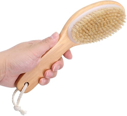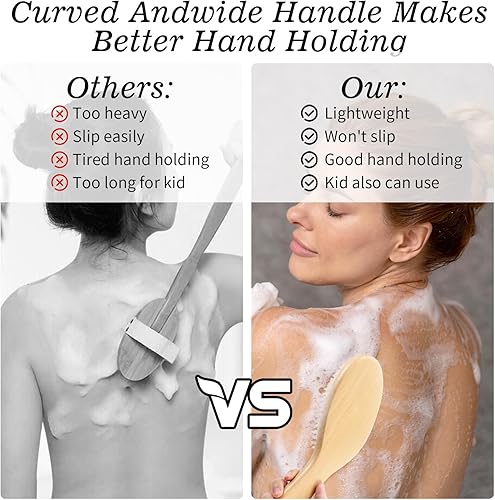 【Curved Wooden Handle Design】The contoured wooden handle of our dry brush ensures a comfortable grip and allows you to effortlessly reach tricky spots like your back, legs, and feet. This thoughtful design makes our dry exfoliating brush an ideal tool for dry brushing. It enhances your skincare routine with ease and precision.