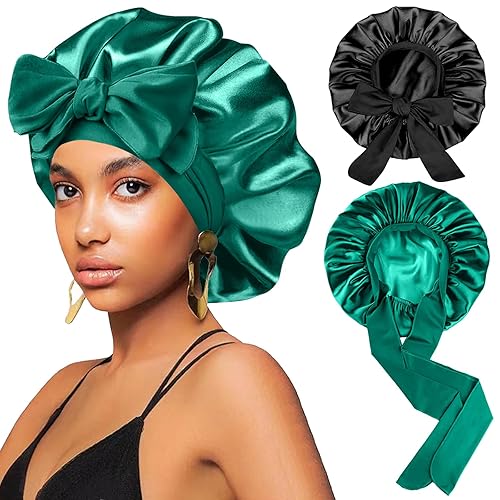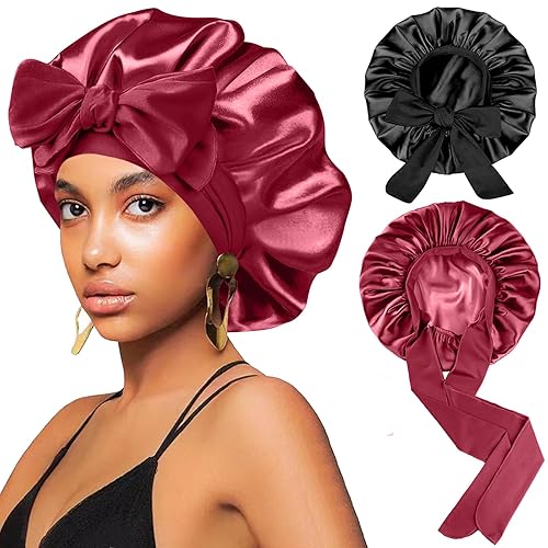 【One Size Fits Most】You'll receive 2pcs tie band silk bonnet 13.8-inch diameter accommodates voluminous curls,braids,locs,waves,long hairstyles.Hair bonnet for sleeping full coverage prevents slippage while protecting curly hair and intricate styles overnight.
