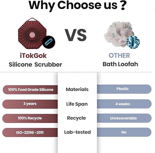 Dual-sided Design:iTokGok Silicone Body Scrubber features two sides - one side with fine bristles for gentle of All skin and Lathers Well, and the other side with Scrubbing fins for exfoliation and thorough cleansing.