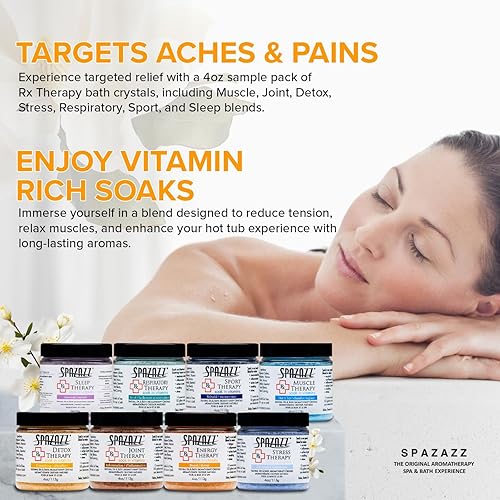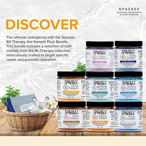 TARGETS ACHES & PAINS: Experience targeted relief with a 4oz sample pack of Rx Therapy bath crystals, including Muscle, Joint, Detox, Stress, Respiratory, Sport, and Sleep blends.