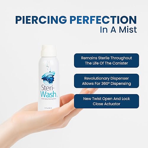 Premium Sterile Saline Solution: Elevate your piercing aftercare with Steri-Wash Piercing Spray, featuring a premium sterilized sodium chloride solution for a gentle and natural cleansing experience.