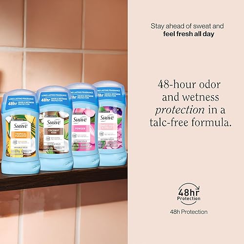SUAVE DEODORANT VARIETY PACK: Each deodorant stick offers a refreshing escape. All in one bundle, enjoy the fresh, uplifting scents of Powder, Tropical Paradise, Coconut Kiss, and Sweet Pea & Violet.