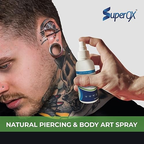 TATTOO & PIERCING AFTERCARE – Superox Skin Spray is the most effective and natural saline wound wash spray. Perfect for use as piercing bump solution, earring cleaner, belly piercing cleaner and tattoo spray. Superox piercing solution is safe for all skin types.