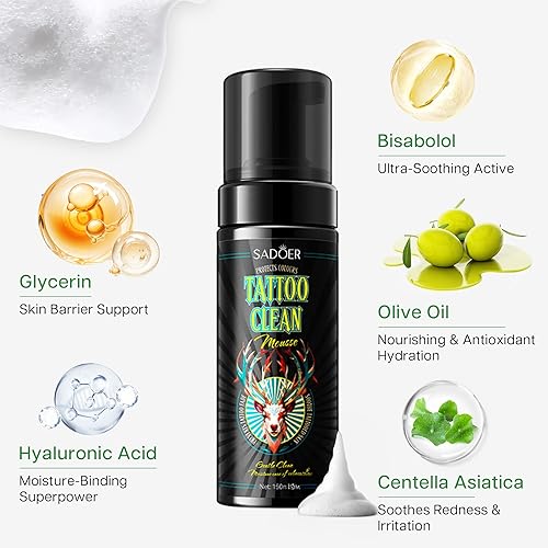 SOOTHES & CALM: Bisabolol (from chamomile) and olive oil work together to calm tattooed skin, reducing discomfort and redness. The lightweight foam rinses cleanly, leaving no residue that could clog pores or fade ink. Ideal for both pre-tattoo prep and post-tattoo maintenance, ensuring clean, vibrant ink without compromising skin.