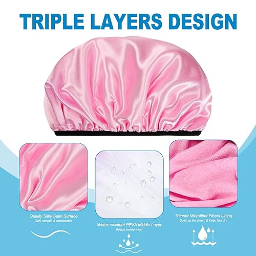 3 LAYERS TERRY LINED SHOWER CAPS - There are 3 layers of our shower caps: Outer layer is made of quality satin which is smooth and soft. The middle layer is waterproof EVA material helps to keep your hair dry. Inner layer is a soft microfibre cloth which can quick absorb the drops of your wet hair and prevent frizz during showering.