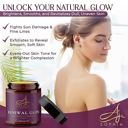 Renewal Glow & Brightening Scrub: AJ Sophia’s renewal glow turmeric face scrub is designed to unlock your skin’s natural radiance. This brightening body scrub helps reduce dullness and uneven tone, enhancing clarity and leaving you with a brighter, more radiant complexion.