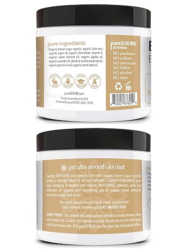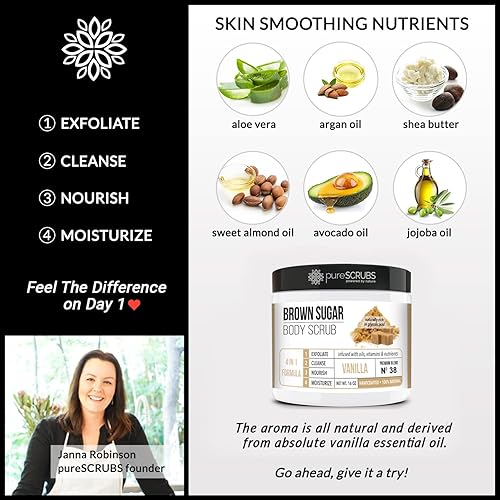 GET ULTRA SMOOTH SKIN FAST - THIS WORKS! Our unique “4 in 1 Formula” does everything a body scrub should do and more. Pure brown sugar crystals infused with essential oils, nutrients and skin softeners helps to smooth away rough, bumpy, and uneven textures to instantly reveal your true soft, healthy and radiant skin. This is formulated to be an unscented scrub, perfect for those with sensitive noses. The only aroma is from the natural, raw ingredients themselves.