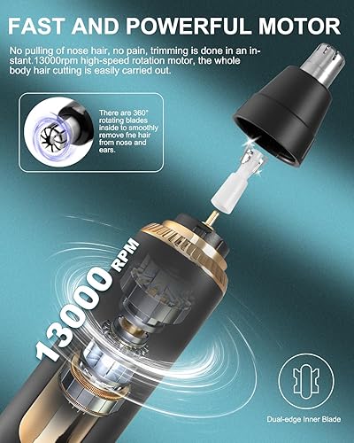 【Excellent and High Qaulity Design】Powered by a high-performance copper-core motor, this nose hair trimmer for men rechargeable and women delivers 13,000 RPM for fast, efficient trimming. The 360° rotating dual-blade system ensures precision, while the stainless steel blades are designed to fit comfortably in the nasal cavity, preventing pulling or irritation. The allergy-resistant material provides a safe and pain-free trimming experience.