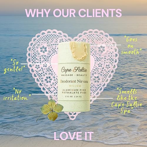 Luxurious, Natural Deodorant for Sensitive Skin: Discover Deodorant Nirvana with Cape Saltie's Willow—phthalate-free, baking soda-free, and scented with pure essential oils for women and men. Its light, earthy, herbal fragrance smells like the Cape Saltie Spa; infused with lemongrass, tangerine, rose, lavender, and ylang-ylang, Willow delivers a bright, uplifting aroma that promotes a positive mood and peaceful spa vibes.