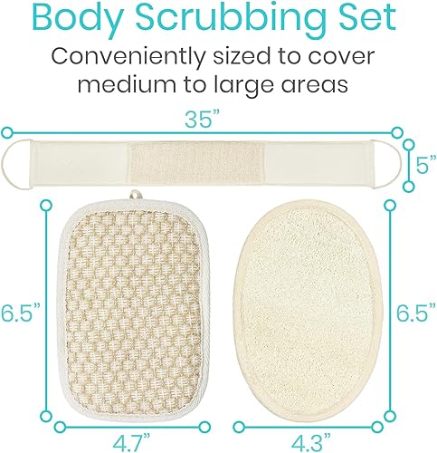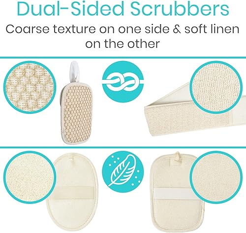 CLEANSE, EXFOLIATE AND REFRESH: Providing an at-home spa experience, the Vive body scrubbing set includes a long back scrubber for cleansing hard to reach areas and two dual-sided scrubbers each made with a different material for varying degrees of exfoliation. The scrubbers also feature secure soap pockets, hand straps or handles for greater convenience while bathing or showering.
