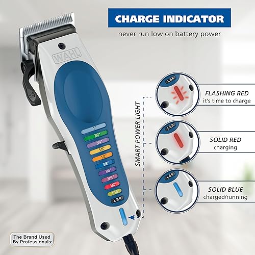 Smart Charge Technology - Stay informed with this cordless hair clipper kit’s smart display light that indicates battery power status: solid blue when fully charged, solid red while charging, and flashing red when low power.