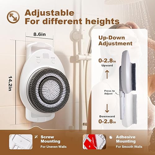Adjustable Electric Shower Brush Body Scrubber: The height of the back plate of this shower back scrubber wall mounted can be adjusted according to your needs, with a total of 8 positions, after you determine the fixed height of the back plate, you can adjust the height of the main body of the electric body scrubber according to the height of each person, which makes it convenient for you and your family to use this electric backscrubber.