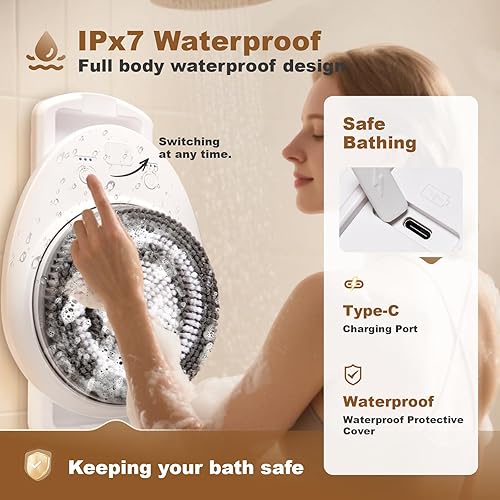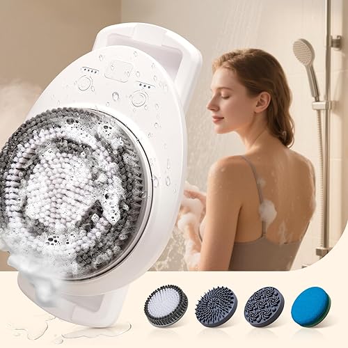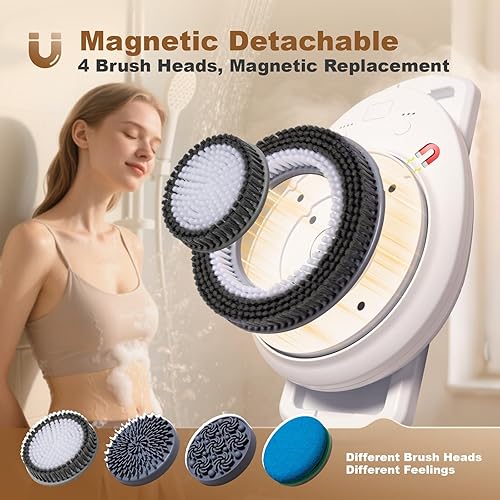 Interchangeable Brush Head: The electric bath brush for body offers three different functions of the inner ring brush head, the first one is a nylon brush head, which can help you to effectively clean the oil on the surface of your skin, the second one is a silicone massage brush head, which can massage your back after cleansing, and the third one is a sponge cleaner brush head, with its own cleaner cloth, which can quickly clean your skin dirt for you.