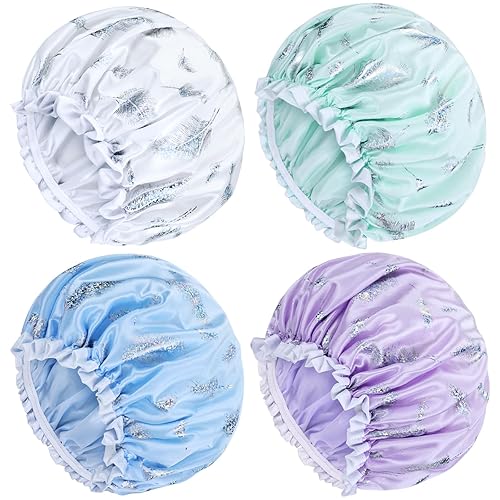 Variety of Styles: The pack includes 4 shower hair caps with different styles including solid colors such as blue, green, gold, gray, black, pink, purple, hot pink, bowknots, daisy flower, butterfly, polka dots, large flower, hearts, stars, feather, offering a range of options to match your mood or outfit.