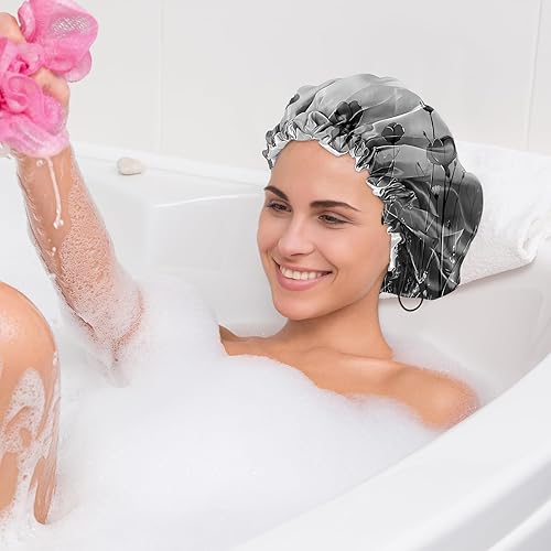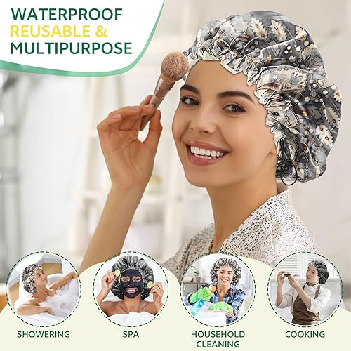 【Reusable Double-Layer Waterproof】This shower cap for women is made of polyester and EVA fabric,which is skin-friendly and breathable comfortable to wear.After using or washing,simply leave your shower cap to dry Ideal for bathing.You'll never have to worry about the outer layer of your shower cap getting wet again.