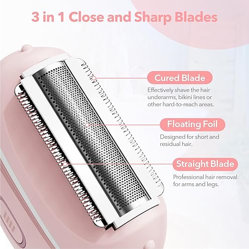 All In One Multi-function Blades: This women electric razor curved blade is designed for armpits, bikini lines; the mesh wide blade for face or around lips; and, the straight blade trimmer hair for arms and legs