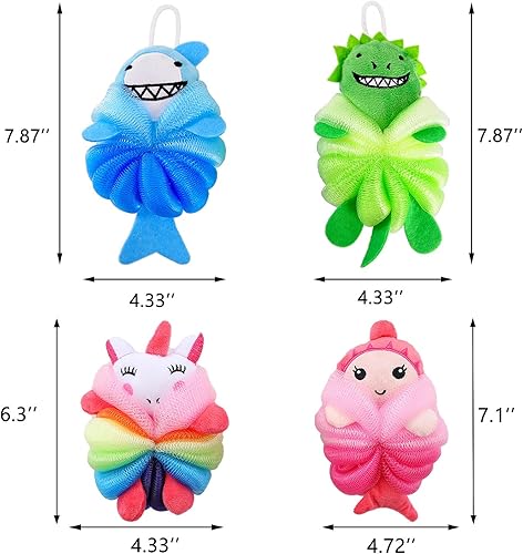 Cute Animal Loofah Design – Comes with 4 pieces of animal loofahs for kids in 4 styles which are designed with lovely animal characters - shark of sea sponge, dinosaur of animal loofah,green frog and white sheep. These cute animal loofah balls are catering to kids' preference. Make bath time more fun with these lovable bath sponges.