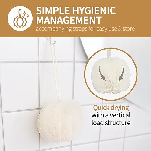 HYGIENINC MAINTENANCE: Ensure a hygienic and clean shower experience with our bath ball. Its vertical structure allows for quick drying and convenient storage. For optimal hygiene, we recommend replacing the pouf every 2 months.